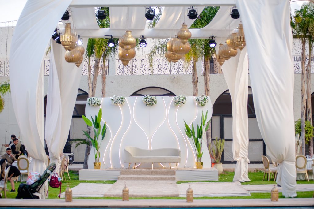 Nous créons des ambiances élégantes mêlant esthétique contemporaine et charme marocain, avec une attention minutieuse portée aux fleurs, au mobilier, à l’éclairage et à la scénographie.